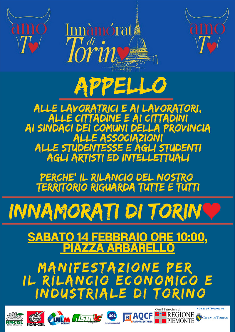 Torino, 14 febbraio – Nel giorno di San Valentino, le sigle territoriali dei metalmeccanici Fim, Fiom, Uilm, Fismic, Uglm e Aqcf promuovono una grande manifestazione per riportare al centro il futuro dell’automotive e dell’intero sistema produttivo locale. Il corteo partirà alle ore 10 da piazza Arbarello e si concluderà in piazza Castello, con la partecipazione di migliaia di lavoratrici e lavoratori provenienti dall’area metropolitana.
